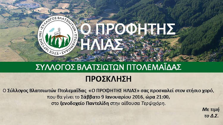 Πτολεμαΐδα 05/01/2016 Ο ετήσιος χορός του Συλλόγου Βλατσιωτών Πτολεμαΐδας «Ο Προφήτης Ηλίας» 0 Ο Σύλλογος Βλατσιωτών Πτολεμαϊδας “Ο ΠΡΟΦΗΤΗΣ ΗΛΙΑΣ” σας προσκαλεί στον ετήσιο χορό, που θα πραγματοποιηθεί το Σάββατο 9 Ιανουαρίου και ώρα 21:00, στην αίθουσα Τερψιχόρη, του ξενοδοχείου “Παντελίδη”. Με εκτίμηση το ΔΣ του Συλλόγου