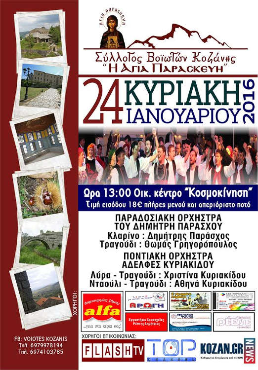 Ο Σύλλογος Βοϊωτών Κοζάνης «Η Αγία Παρασκευή» σας προσκαλεί στον Ετήσιο Χορό του Συλλόγου, την Κυριακή 24 Ιανουαρίου 2016 και ώρα 13:00 (μεσημέρι), στο οικ. Κέντρο «ΚΟΣΜΟΚΙΝΗΣΗ» στην Κοζάνη.