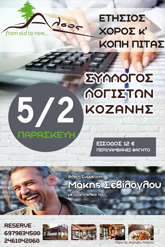 Ο ετήσιος χορος του Συλλόγου Λογιστών Κοζάνης θα πραγματοποιηθεί την Παρασκεήυ 5 Φεβρουαρίου στο Άλσος Wine Bar με τη φιλική συμμετοχή του εξαιρετικού Μάκη Σεβίλογλου και του επιτελείου του!