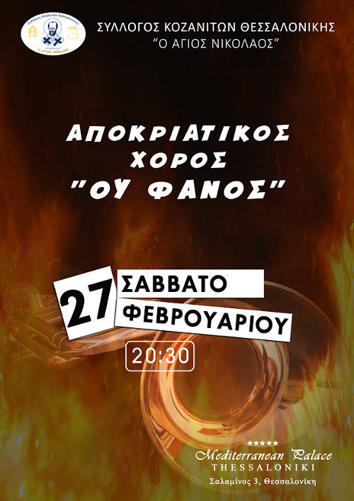 Ο Σύλλογος Κοζανιτών Θεσσαλονίκης «Ο Άγιος Νικόλαος» πραγματοποιεί για ακόμη μια χρονιά τον αποκριάτικο χορό του “Ου Φανός” το Σάββατο 27 Φεβρουαρίου, στις 20:30 στο ξενοδοχείο Mediterranean Palace Hotel (Σαλαμίνος 3, Θεσσαλονίκη).