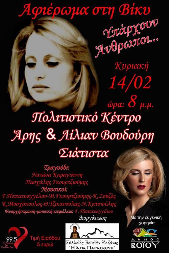 Ο Σύλλογος Βοϊωτών Κοζάνης “Η ΑΓΙΑ ΠΑΡΑΣΚΕΥΗ”, σας προσκαλεί στη μουσική παράσταση, «Υπάρχουν άνθρωποι…», ένα μουσικό ταξίδι αφιερωμένο στα τραγούδια της σπουδαίας ελληνίδας ερμηνεύτριας, Βίκυς Μοσχολιού.