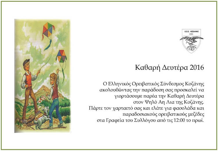 Ο Ελληνικός Ορειβατικός Σύνδεσμος Κοζάνης ακολουθώντας την παράδοση σας προσκαλεί να γιορτάσουμε παρέα την Καθαρή Δευτέρα στον Ψηλό Αη Λια της Κοζάνης.