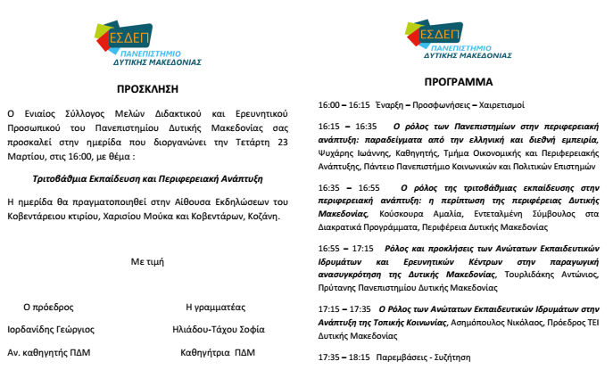 Ημερίδα την Τετάρτη 23 Μαρτίου 2016 από τον Ενιαίο Σύλλογο Μελών Διδακτικού και Ερευνητικού Προσωπικού του Πανεπιστημίου Δυτικής Μακεδονίας με θέμα: “Τριτοβάθμια Εκπαίδευση και Περιφερειακή Ανάπτυξη”.