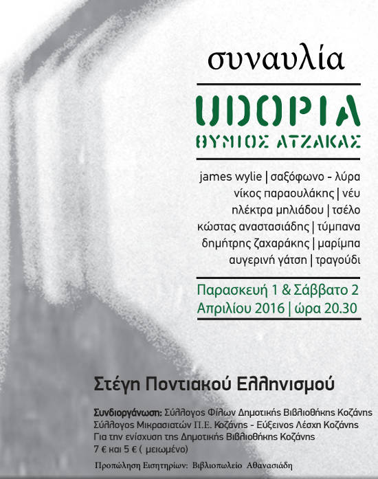 Με το Θύμιο Ατζακά και τους εξαιρετικούς συμπρωταγωνιστές μουσικούς, ο Σύλλογος Φίλων της Κοβενταρείου Δημοτικής Βιβλιοθήκης Κοζάνης, ο Σύλλος Μικρασιατών Π.Ε. Κοζάνης και η Εύξεινος Λέσχη Κοζάνης χαρίζουν στους φίλους τους ένα ταξίδι στη Udopia την Παρασκευή 1 και το Σάββατο 2 Απριλίου 2016 και ώρα 20.30 στη Στέγη Ποντιακού Ελληνισμού. Η εκδήλωση γίνεται για την ενίσχυση της Δημοτικής Βιβλιοθήκης Κοζάνης.