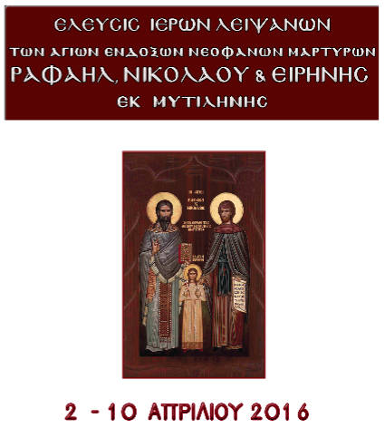 Ανακοινώνεται ότι τεμάχιο ιερών Λειψάνων των Αγίων ενδόξων νεοφανών μαρτύρων Ραφαήλ, Νικολάου και Ειρήνης θα φθάσουν από την Ιερά Μονή Αγίου Ραφαήλ Μυτιλήνης στον Ιερό Καθεδρικό και Μητροπολιτικό Ναό του Αγίου Νικολάου το Σάββατο 2 Απριλίου 2016 στις 6 το απόγευμα.