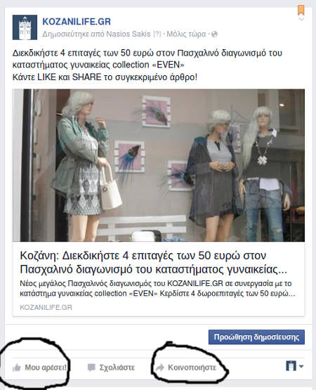 2) Μεταφερθείτε στην Funpage του KOZANILIFE.GR στο facebook (κάνοντας κλικ εδώ) και αφού γίνεται θαυμαστής μας, κάντε Like και Share στο συγκεκριμένο άρθρο του διαγωνισμού που θα βρείτε εκεί!