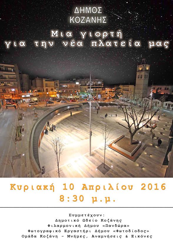 «Μια γιορτή για τη νέα μας πλατεία» είναι ο τίτλος της εκδήλωσης που θα πραγματοποιηθεί το βράδυ της Κυριακής 10 Απριλίου και ώρα 20:30 στην κεντρική πλατεία της πόλης από τον Δήμο Κοζάνης, με ένα αρκετά πλούσιο μουσικό και όχι μόνο πρόγραμμα, σύμφωνα με τις πληροφορίες του KOZANILIFE.GR.