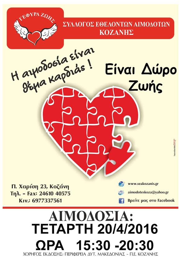 Ο Σύλλογος Εθελοντών Αιμοδοτών Κοζάνης ¨Γέφυρα Ζωής¨, διοργανώνει την 10η Αιμοδοσία του 2016, σε συνεργασία με το τμήμα Αιμοδοσίας του Γεν. Μαμάτσειου Νοσοκομείου την Τετάρτη 20 Απριλίου 2016 από τις 15:30 – 20:30, (προσέλευση μέχρι 20:00), στα γραφεία του Συλλόγου, Π. Χαρίση 23.