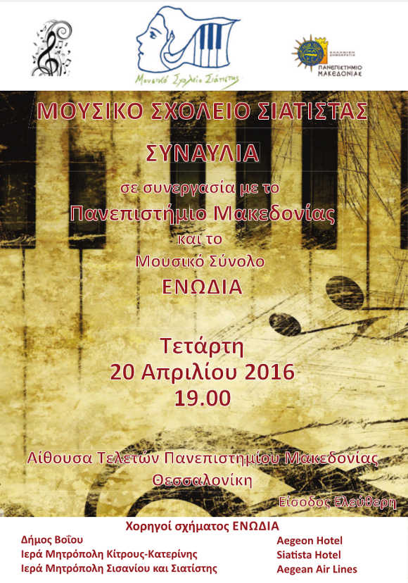 Συναυλία του Μουσικού Σχολείου Σιάτιστας θα πραγματοποιηθεί στην Αίθουσα Τελετών του Πανεπιστημίου Μακεδονίας την Τετάρτη 20 Απριλίου 2016 ώρα 7.00 μ. μ.