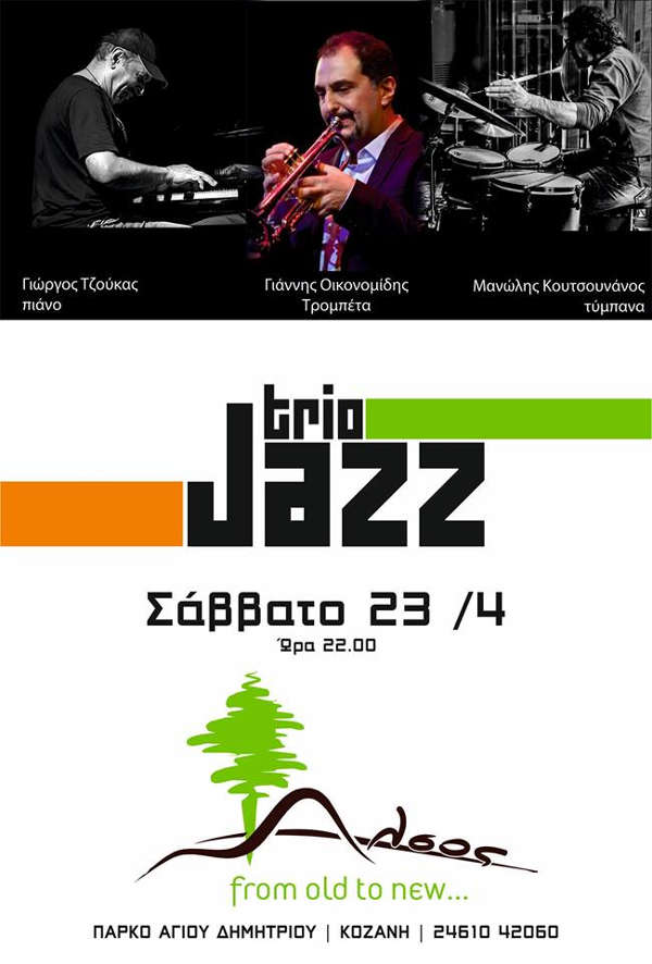 Μια ξεχωριστή «Trio Jazz» βραδιά με τους Γιώργο Τζούκα, Γιάννη Οικονομίδη και Μανώλη Κουτσουνάνο θα έχουν την ευκαιρία να απολαύσουν όσοι βρεθούν το βράδυ του Σαββάτου 23 Απριλίου στο Wine Bar Άλσος στην Κοζάνη.