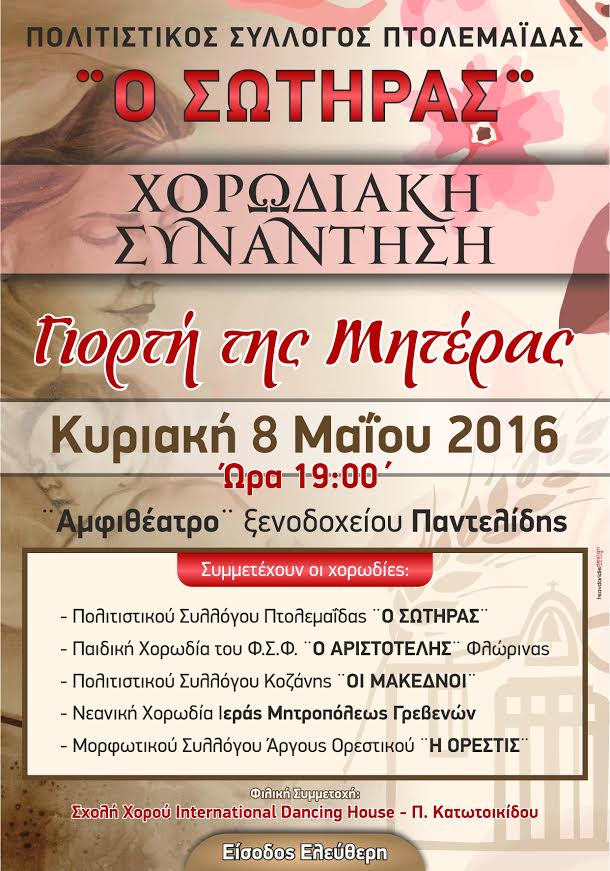 Η Χορωδία του Πολιτιστικού Συλλόγου Κοζάνης «οι Μακεδνοί», την Κυριακή, 8-5-2016, θα μεταβεί στην Πτολεμαϊδα, προσκεκλημένη από τον Πολιτιστικό Σύλλογο «Ο ΣΩΤΗΡΑΣ», προκειμένου να συμμετέχει στην Χορωδιακή Συνάντηση που διοργανώνει, στο Αμφιθέατρο ξενοδοχείου Παντελίδης, για την Γιορτή της Μητέρας.