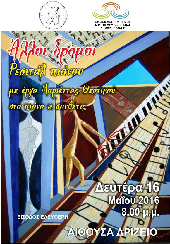 Ρεσιτάλ πιάνου της βραβευμένης Μαριέττας Θεοτικού με τίτλο «Άλλοι Δρόμοι» θα έχει την ευκαιρία να παρακολουθήσει το μουσικόφιλο κοινό της Κοζάνης τη Δευτέρα 16 Μαίου στις 8 το βράδυ στην αίθουσα εκδηλώσεων του Δημοτικού Ωδείου Κοζάνης.