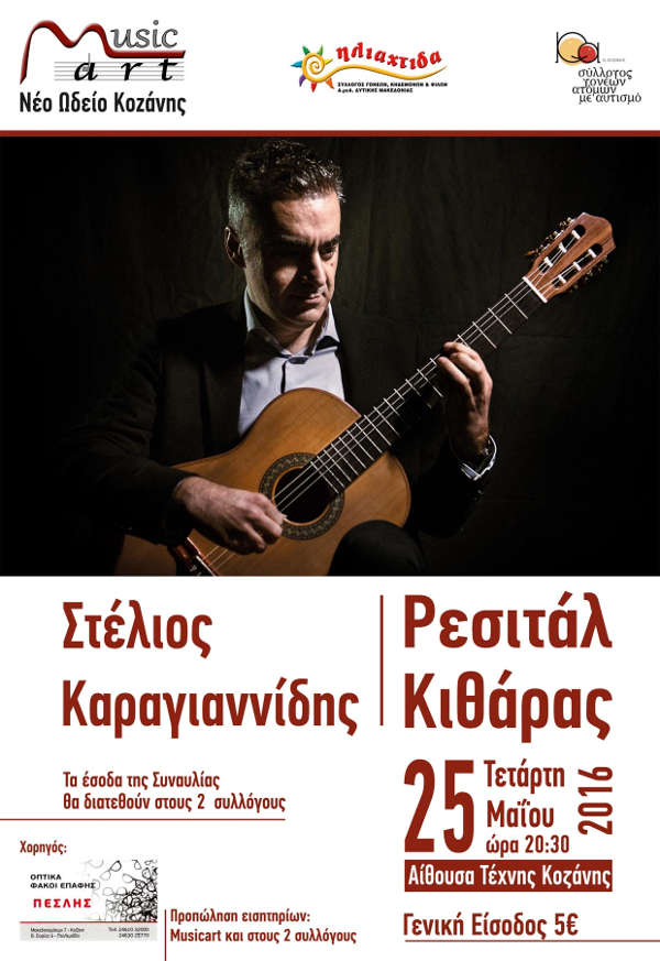 Η Musicart- Νέο Ωδείο Κοζάνης, ο Σύλλογος Γονέων Ατόμων με Αυτισμό και ο Σύλλογος Ηλιαχτίδα σας προσκαλούν στο ρεσιτάλ κιθάρας του Στέλιου Καραγιαννίδη την Τετάρτη 25 Μαΐου 2016 και ώρα 8:30μ.μ στην Aίθουσα Τέχνης.