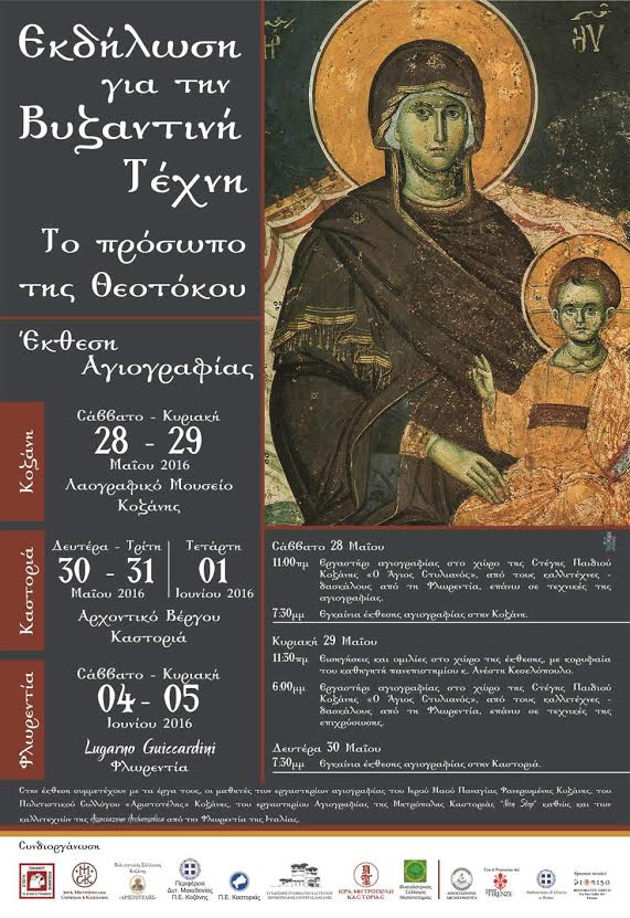 Η Περιφέρεια Δυτικής Μακεδονίας, η Περιφερειακή Ενότητα Κοζάνης και η Περιφερειακή Ενότητα Καστοριάς σε συνεργασία με τη Στέγη Παιδιού Κοζάνης «Ο Άγιος Στυλιανός», το Φυσιολατρικό Σύλλογο Μεσοποταμίας Καστοριάς και τα εργαστήρια αγιογραφίας του Ιερού Ναού Παναγίας Φανερωμένης Κοζάνης, του Πολιτιστικού Συλλόγου «Αριστοτέλης», του εργαστηρίου Αγιογραφίας της Μητρόπολης Καστοριάς “Non Stop” και του εργαστηρίου αγιογραφίας της «Associazione Archeosofica» στη Φλωρεντία, διοργανώνουν μία πρωτότυπη πολιτιστική εκδήλωση με κεντρικό άξονα την βυζαντινή τέχνη και τίτλο «Εκδήλωση για τη Βυζαντινή Τέχνη, το πρόσωπο της Θεοτόκου μέσα στο χρόνο». Τα εγκαίνια της εκδήλωσης θα πραγματοποιηθούν στις 28 Μαΐου στην Κοζάνη και στις 30 Μαΐου στην Καστοριά.