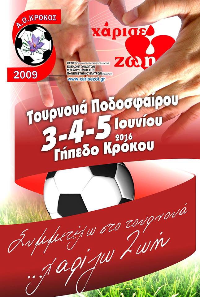 Η Ακαδημία Ποδοσφαίρου Α.Ο. Κρόκος όπως κάθε χρόνο έτσι και φέτος 3,4,και 5 Ιουνίου 2016 στο Δημοτικό Γήπεδο Κρόκου διοργανώνει Τουρνουά Ποδοσφαίρου στο οποίο θα συμμετέχουν ομάδες ακαδημιών απ’ όλη την Π.Ε. Κοζάνης.