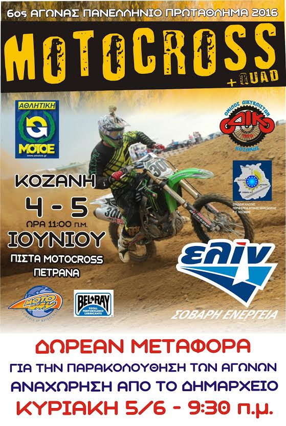 Ο Όμιλος Δικυκλιστών Κοζάνης Ο.ΔΙ.ΚΟ. σε συνεργασία με το ΚΤΕΛ Κοζάνης θα πραγματοποιήσει τη δωρεάν μεταφορά του κόσμου, για το Πανελλήνιο Πρωτάθλημα Motocross, την Κυριακή 5-6-2016 από την κεντρική πλατεία Κοζάνης στη πίστα Πετρανών, με ώρα αναχώρησης 9:30π.μ και επιστροφή στις 5:00μ.μ.