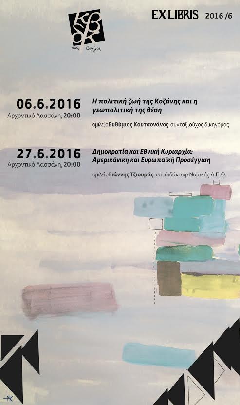 Η Κοβεντάρειος Δημοτική Βιβλιοθήκη Κοζάνης σας προσκαλεί σε ομιλία με θέμα “ Η πολιτική ζωή της Κοζάνης και η γεωπολιτική της θέση” με εισηγητή τον κ. Ευθύμιο Κουτσονάνο, συνταξιούχο δικηγόρο, στη Δημοτική Χαρτοθήκη (Αρχοντικό Λασσάνη), τη Δευτέρα 6 Ιουνίου 2016, στις 8:00΄μ.μ.