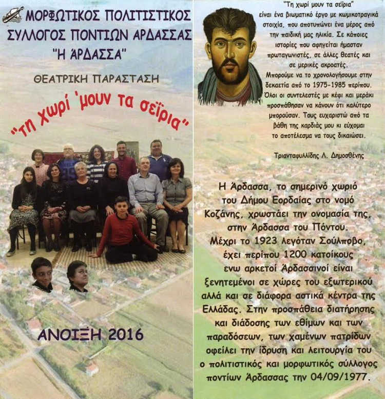 Πτολεμαΐδα 03/06/2016 «Τη χωρί’μουν τα σεΐρια»: Η Ποντιακή Θεατρική Παράσταση του Συλλόγου Ποντίων Άρδασσας στην Πτολεμαΐδα 0 Τη χωρί ´μουν τα σεΐρια – Η Ποντιακή Θεατρική Παράσταση του Συλλόγου Ποντίων Άρδασσας την Κυριακή 5 Ιουνίου,στις 20.00′ μ.μ. στο Αμφιθέατρο του Ξενοδοχείου Παντελίδης.