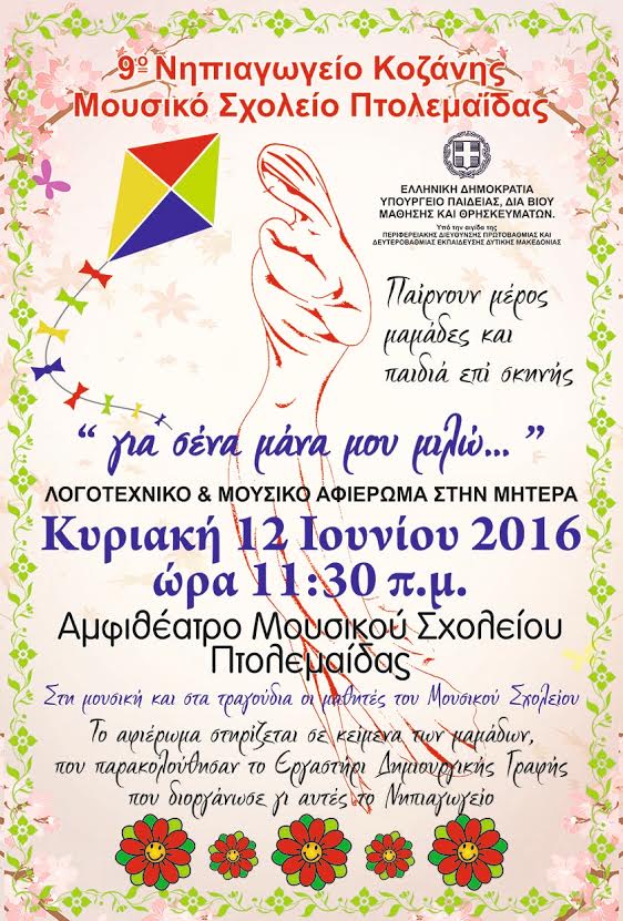 Το 9ο Νηπιαγωγείο Κοζάνης και το Μουσικό Σχολείο Πτολεμαΐδας σας προσκαλούν στο Λογοτεχνικό και Μουσικό Δρώμενο: «για σένα Μάνα μου μιλώ», την Κυριακή 12 Ιουνίου 2016, στο Μουσικό Σχολείο Πτολεμαΐδας στις 11.30 πμ. με είσοδο ελεύθερη.