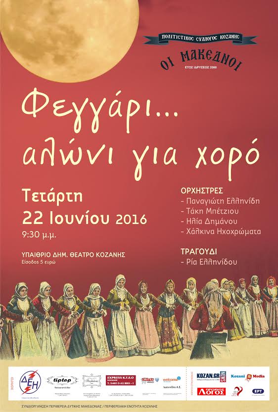 Ο Πολιτιστικός Σύλλογος Κοζάνης «Οι Μακεδνοί», την Τετάρτη 22 Ιουνίου 2016 στις 9:30 μ.μ., στο Υπαίθριο Δημοτικό Θέατρο, υμνεί την παράδοση στου φεγγαριού τ’ αλώνι…!!