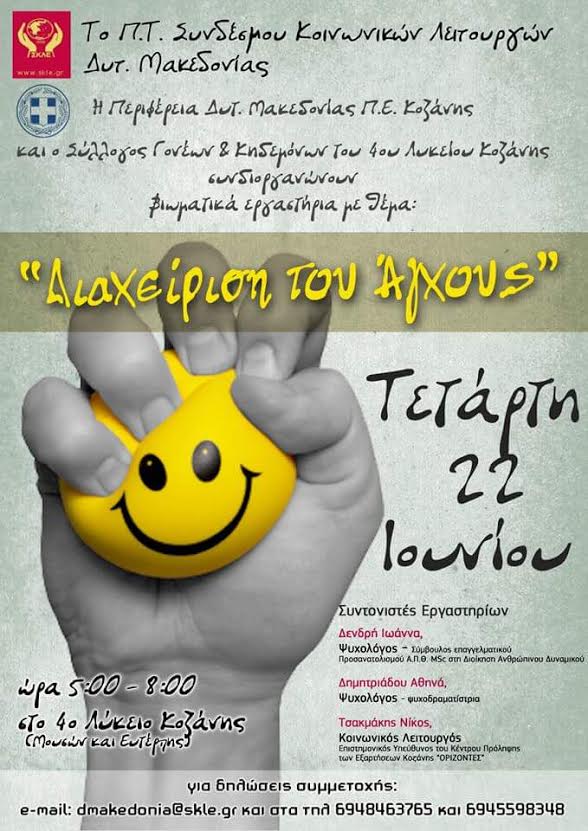 Κατόπιν του μεγάλου ενδιαφέροντος του κοινού για την παρακολούθηση ημερίδας, που πραγματοποίησε το Π.Τ. Συνδέσμου Κοινωνικών Λειτουργών Δυτ. Μακεδονίας, συνδιοργανώνουμε με την Περιφέρεια Δυτικής Μακεδονίας Π.Ε. Κοζάνης και το Σύλλογο Γονέων και Κηδεμόνων του 4ου Γενικού Λυκείου Κοζάνης, βιωματικά εργαστήρια με θέμα «Διαχείριση του Άγχους», την Τετάρτη, 22 Ιουνίου 2016, από τις 5μμ έως τις 8μμ, στο 4ο Γενικό Λύκειο Κοζάνης (oδός Μουσών και Ευτέρπης).