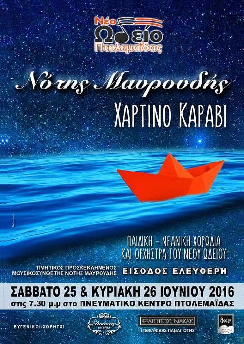 Η διεύθυνση, το καλλιτεχνικό προσωπικό και οι σπουδαστές του Νέου Ωδείου Πτολεμαΐδας προσκαλούν όλους τους φίλους της μουσικής στις παραστάσεις “Χάρτινο Καράβι” του Νότη Μαυρουδή.