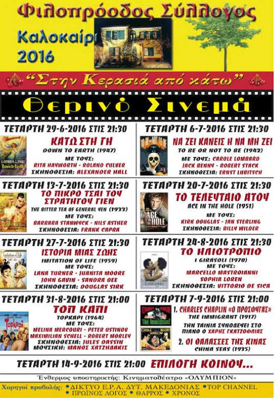 Με μια κλασική φαντασμαγορική ταινία του 1947, που αν και απρόβλητη εδώ και πολλά χρόνια, αποτέλεσε μια από τις μεγαλύτερες προσωπικές επιτυχίες της πάλαι ποτέ γόησσας του Χόλιγουντ Ρίτα Χέιγουορθ, ξεκινάει και φέτος τις καλοκαιρινές του κινηματογραφικές προβολές ο Φιλοπρόοδος Σύλλογος Κοζάνης, αυτή την Τετάρτη 29-6-2016, στις 9:30 μ.μ., στην αυλή του στεκιού. Πρόκειται για τη διασκεδαστική κωμωδία φαντασίας, με στοιχεία μιούζικαλ, με τίτλο «Κάτω στη γη» (Down to Earth – 1947) σε σκηνοθεσία Αλεξάντερ Χολ. Πλάι στη Χέιγουορθ οι Λάρι Παρκς, Μαρκ Πλατ, Τζέιμς Γκλίσον. Όσο για τον κοινωνικό χαρακτήρα των προβολών, για πέμπτη συνεχόμενη χρονιά ο σύλλογος καλεί τους συνεφίλ να φέρνουν μαζί τους τρόφιμα μακράς διάρκειας, προκειμένου να ενισχυθεί το Παντοπωλείο του συλλόγου που ενισχύει συμπολίτες μας που αδυνατούν να αντεπεξέλθουν στις βασικές τους ανάγκες.