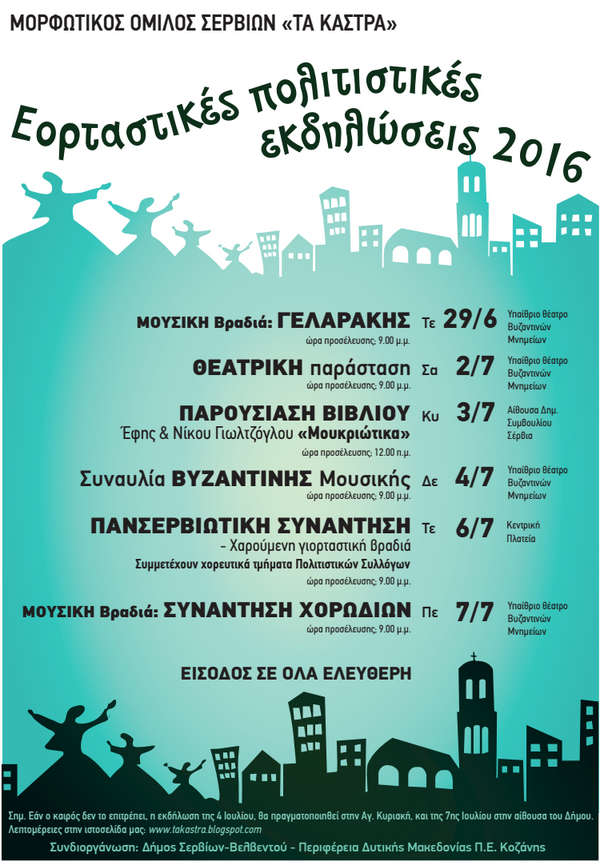 Σέρβια - Βελβεντό 27/06/2016 Πολλές οι εορταστικές πολιτιστικές εκδηλώσεις του Μορφωτικού Ομίλου Σερβίων «Τα Κάστρα» 0 Πλούσιες οι εορταστικές πολιτιστικές εκδηλώσεις του Μορφωτικού Ομίλου Σερβίων «Τα Κάστρα». Δείτε τις δηλώσεις της Χρυσάνθης Καραγιαννίδου, Προέδρου Μ.Ο. Σερβίων ΄΄Τα Κάστρα΄΄: