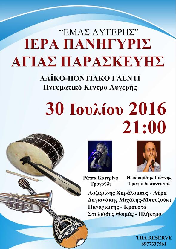 Ο Εκπολιτιστικός, Μορφωτικός και Αθλητικός Σύλλογος Λυγερής σας καλεί να τιμήσετε με την παρουσία σας, το πανηγύρι του χωριού, με αφορμή τη γιορτή της Αγίας Παρασκευής, με Λαϊκό – Ποντιακό πρόγραμμα, που θα γίνει το Σάββατο 30 Ιουλίου 2016 από τις 9:00 μ.μ. και όσο αντέχετε, στην αυλή του Πνευματικού Κέντρου Λυγερής
