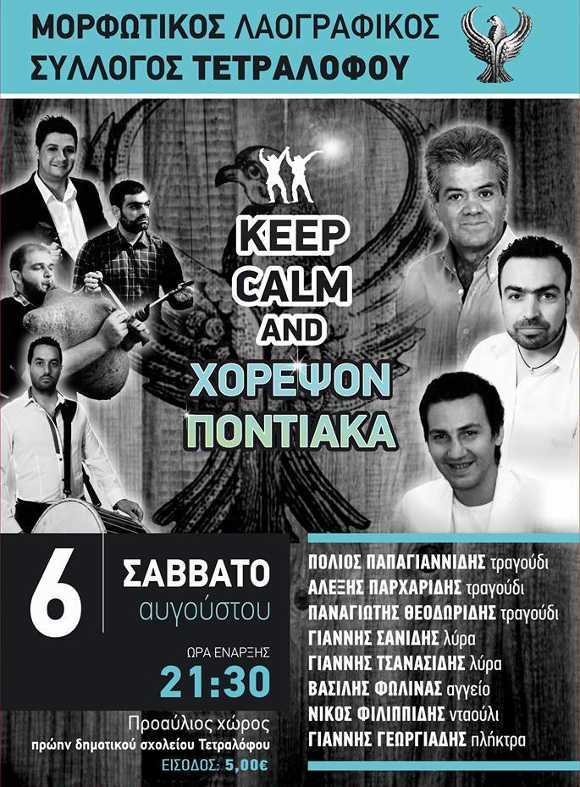 Κοζάνη 05/08/2016 Ποντιακή ζωντανή βραδιά από τον Σύλλογο Τετραλόφου Κοζάνης 0 Ποντιακή ζωντανή βραδιά από τον Σύλλογο Τετραλόφου Κοζάνης, το Σάββατο 6 Αυγούστου. Περισσότερες πληροφορίες, στην παρακάτω αφίσα: