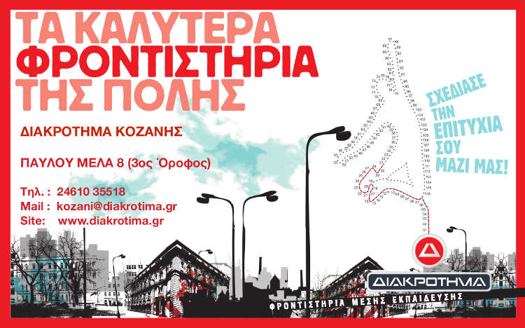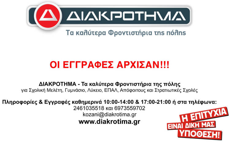 Ο εκπαιδευτικός όμιλος ΔΙΑΚΡΟΤΗΜΑ, η μεγαλύτερη αλυσίδα φροντιστηρίων σε Ελλάδα και Κύπρο σήμερα, με 20 χρόνια παρουσίας, 60 φροντιστήρια σε λειτουργία, 480 καθηγητές και περίπου 3.500 μαθητές σε μέση ετήσια βάση, έρχεται τώρα κοντά σας και εγκαινιάζει το νέο του εκπαιδευτήριο ΔΙΑΚΡΟΤΗΜΑ στην καρδιά της Κοζάνης!