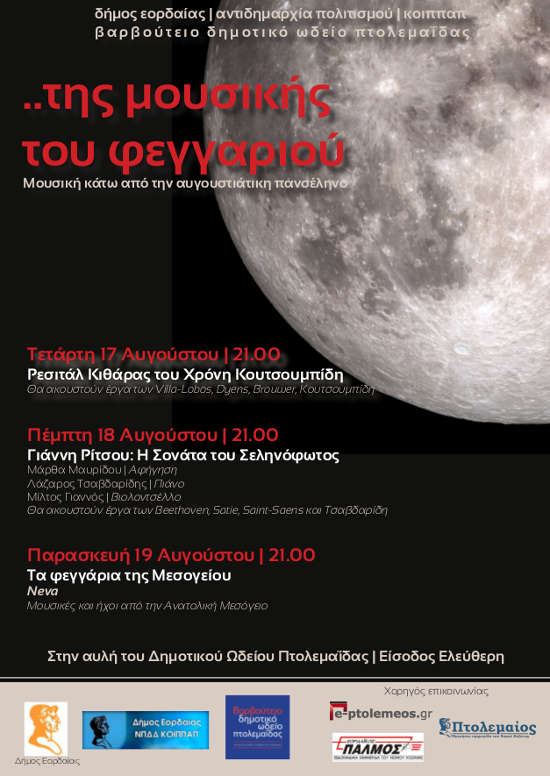 Μέσα σε τρεις μέρες, την ΤΕΤΑΡΤΗ 17, την ΠΕΜΠΤΗ 18 και την ΠΑΡΑΣΚΕΥΗ 19 Αυγούστου, τα τρία πιο φωτεινά βράδια του Αυγούστου, κάτω από το μοναδικό Αυγουστιάτικο φεγγάρι η μουσική θα γίνει συνοδοιπόρος των φιλόμουσων και όχι μόνο στη δροσερή αυλή του Δημοτικού Ωδείου Πτολεμαΐδας