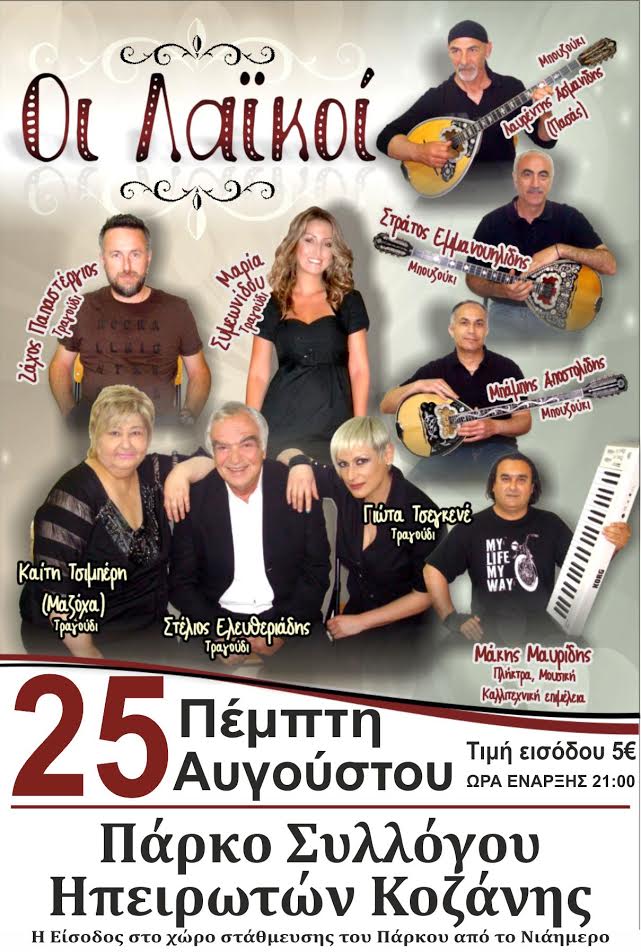 Οι εκδηλώσεις θα ολοκληρωθούν την Πέμπτη 25 Αυγούστου 2016 και ώρα 09:00 μ.μ. με λαϊκή βραδιά, με το γνωστό μουσικό σχήμα της Κοζάνης «Οι Λαϊκοί».