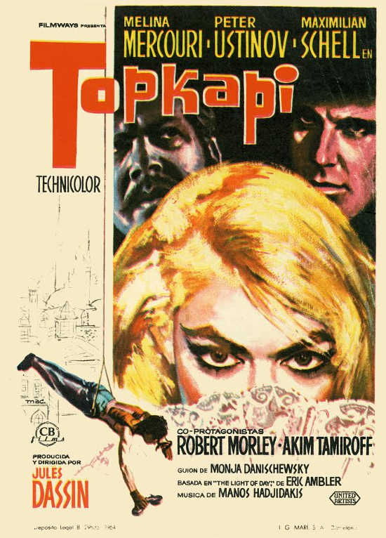 «Τοπ Καπί» (Topkapi -1964). Σκηνοθεσία: Ζιλ Ντεσέν. Ηθοποιοί: Μελίνα Μερκούρη, Μαξιμίλιαν Σελ, Πίτερ Ουστίνοφ, Ρόμπερτ Μόρλει, Ακίμ Ταμίροφ, Τίτος Βανδής, Δέσπω Διαμαντίδου, Τζο Ντασέν.