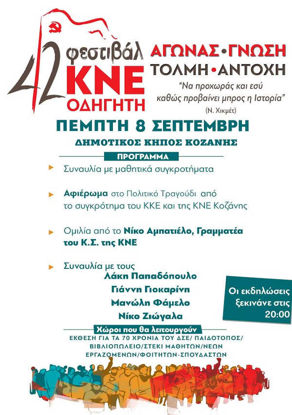 42ο Φεστιβάλ ΚΝΕ-Οδηγητή Πέμπτη 8 Σεπτέμβρη στο Δημοτικό Κήπο Κοζάνης.