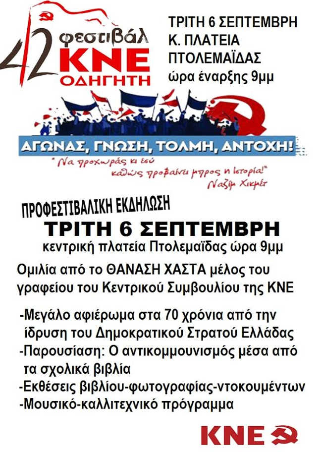 Πολιτικά, Πτολεμαΐδα 04/09/2016 Προφεστιβαλική εκδήλωση της ΚΝΕ στην κεντρική πλατεία της Πτολεμαΐδας 0 Προφεστιβαλική εκδήλωση της ΚΝΕ στην Πτολεμαΐδα την Τρίτη 6 Σεπτεμβρίου. Δείτε το πρόγραμμα στην παρακάτω αφίσα: