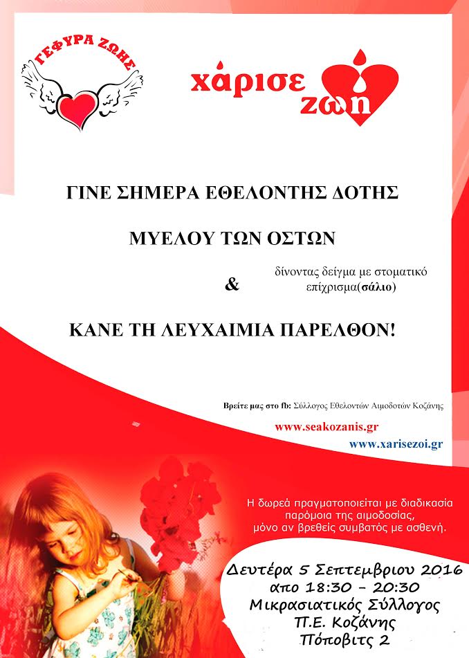 Την Δευτέρα 5 Σεπτεμβρίου στο στέκι του Μικρασιατικού Συλλόγου Π.Ε. Κοζάνης (Πόποβιτς 2) από τις 18.30 θα γίνει ενημέρωση και λήψη δείγματος για τη δωρεά του μυελού των οστών, από τον Σύλλογο Εθελοντών Αιμοδοτών Κοζάνης “Γέφυρα Ζωής”. Αφορμή; Η έναρξη της νέας χρονιάς του συλλόγου, όπου θα τελεστεί και ο καθιερωμένος αγιασμός.
