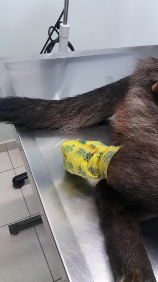 Το ζώο μάλιστα αναγκάστηκε να κόψει με τα δόντια του το σάπιο του πόδι για να ελευθερωθεί!!! Η σκυλίτσα βρέθηκε τρομαγμένη στα Ηπειρώτικα μέσα σε ένα γκαράζ και μεταφέρθηκε στον κτηνίατρο κ .Χριστόπουλο. Ο κτηνίατρος της καθάρισε το τραύμα και έκοψε τον σφιχτό κόμπο που έδεσε ο βασανιστής του άτυχου ζώου στο πόδι του, το οποίο είναι φυσικά πάρα πολύ φοβισμένο αφού προσπαθούσαμε επί 2 ώρες να το πιάσουμε και τελικά αναγκαστήκαμε να χρησιμοποιήσουμε πνίχτη γιατί δεν γινόταν διαφορετικά.