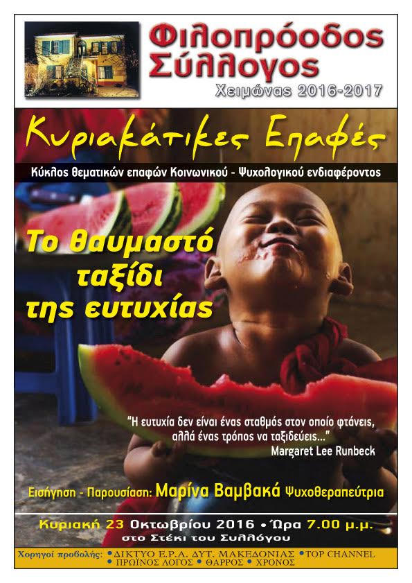Κυριακή 23 Οκτωβρίου 2016, στις 7:00 το απόγευμα, στο Στέκι του Συλλόγου (Γ. Αγόρα 6) Τηλ. επικοινωνίας: 6945292521