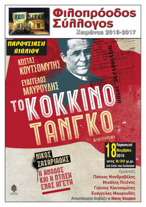 Τίτλος του βιβλίου «Το κόκκινο ταγκό» που εκδόθηκε πρόσφατα με συγγραφείς τον Κώστα Κουτσομύτη και τον Ευάγγελο Μαυρουδή.