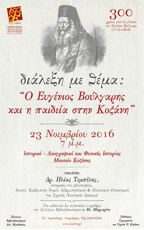 Η Κοβεντάρειος Δημοτική Βιβλιοθήκη Κοζάνης σε συνεργασία με τον Σύνδεσμο Γραμμάτων και Τεχνών Ν. Κοζάνης και τον Σύλλογο Βιβλιοθηκονόμων Δυτ. Μακεδονίας σας προσκαλούν σε ομιλία με θέμα “Ο Ευγένιος Βούλγαρης και η παιδεία στην Κοζάνη”