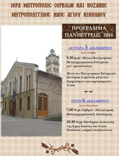 Τον πολιούχο και προστάτη της Άγιο Νικόλαο τιμά με τη δέουσα λαμπρότητα και θρησκευτική κατάνυξη η Κοζάνη και σύμπασα η Ιερά Μητρόπολη Σερβίων και Κοζάνης, στον ομώνυμο Ιερό Μητροπολιτικό και Καθεδρικό Ναό της πόλης.