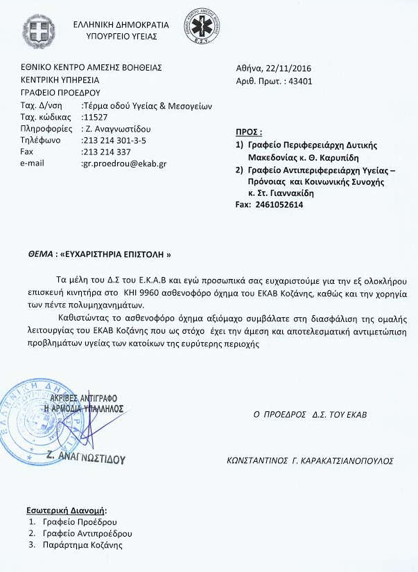 Ευχαριστήρια επιστολή του ΕΚΑΒ προς την Περιφέρεια Δυτικής Μακεδονίας