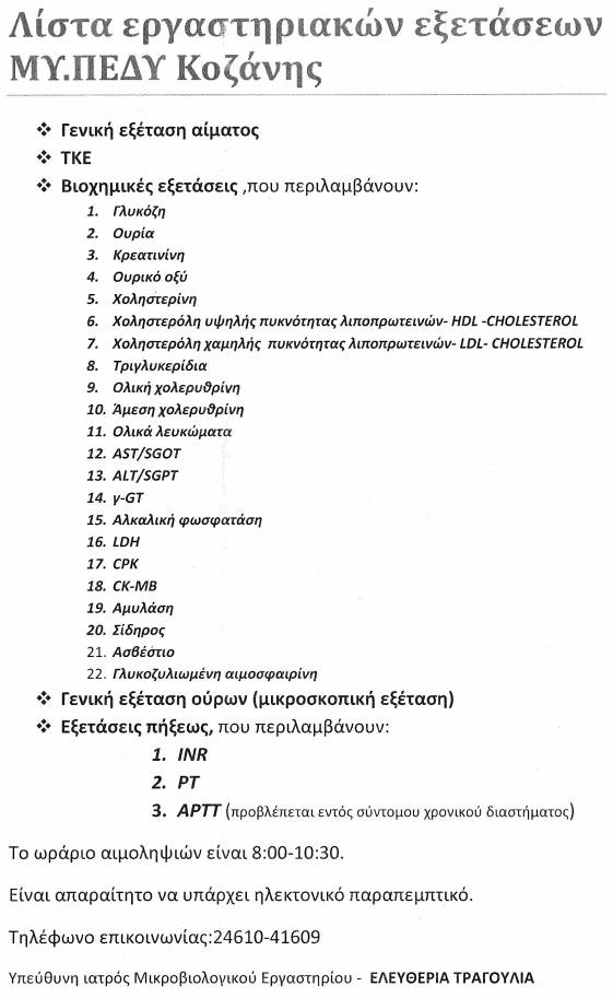 Δείτε τον πίνακα με τις μικροβιολογικές εξετάσεις που πραγματοποιούνται στη Μονάδα Υγείας ΠΕΔΥ Κοζάνης (πρώην Ιατρεία ΙΚΑ) Αριστοφάνους 5Α για όλους τους ασφαλισμένους ΕΟΠΥΥ και ανασφάλιστους και ασφαλισμένους της ΔΕΗ, μετά την μεταστέγαση του ασφαλιστικού της ΔΕΗ Κοζάνης στο κτίριο της Μ.Υ-ΠΕΔΥ Κοζάνης.