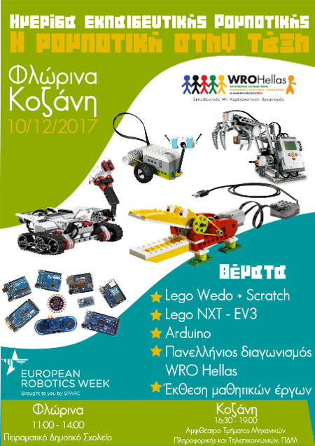 Στο πλαίσιο του Πανελλήνιου Διαγωνισμού Εκπαιδευτικής Ρομποτικής WRO Hellas και της Ευρωπαϊκής Εβδομάδας Ρομποτικής (EuropeanRoboticsWeek), το 1ο Εργαστηριακό Κέντρο Κοζάνης (1ο ΕΚ) σε συνεργασία με το Πειραματικό Δημοτικό Σχολείο Φλώρινας διοργανώνουν, υπό την αιγίδα της Περιφερειακής Δ/νσης Δυτικής Μακεδονίας, ημερίδα Εκπαιδευτικής Ρομποτικής με θέμα «Η ρομποτική στην τάξη».