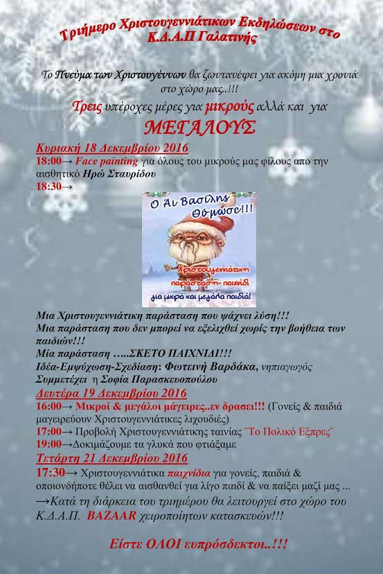 Βόιο 11/12/2016 Τριήμερο Χριστουγεννιάτικων εκδηλώσεων στο Κ.Δ.Α.Π Γαλατινής 0 Τριήμερο Χριστουγεννιάτικων εκδηλώσεων στο Κ.Δ.Α.Π Γαλατινής