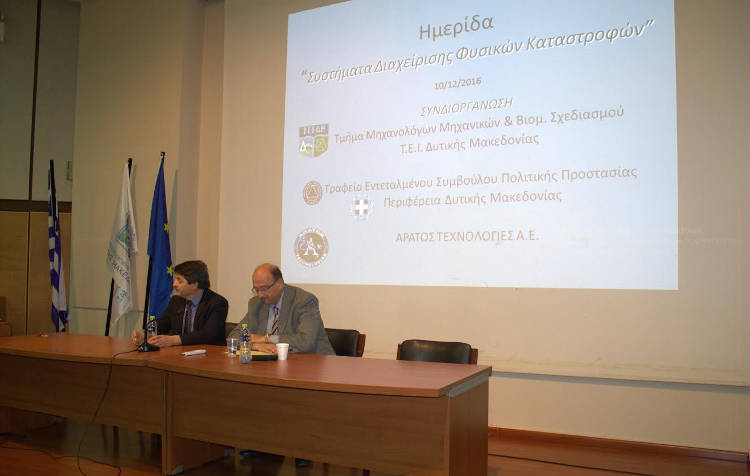 Η παρουσίαση έγινε, στο πλαίσιο της ημερίδας με θέμα «Συστήματα Διαχείρισης Φυσικών Καταστροφών», μια συνδιοργάνωση του Ιδρύματος με το Γραφείο του Εντεταλμένου Συμβούλου Πολιτικής Προστασίας της Περιφέρειας Δυτικής Μακεδονίας κ. Ηλία Κάτανα και την εταιρεία ΑΡΑΤΟΣ ΤΕΧΝΟΛΟΓΙΕΣ Α.Ε., το Σάββατο 10 Δεκεμβρίου και ώρα 10:00 π.μ. στο Μεγάλο Αμφιθέατρο του Ιδρύματος στην Κοζάνη.