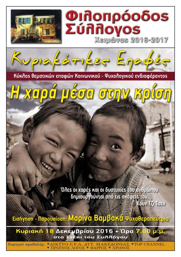 O Φιλοπρόοδος Σύλλογος Κοζάνης, σας προσκαλεί στις «Κυριακάτικες Επαφές» του Δεκεμβρίου με θέμα «Η χαρά μέσα στην κρίση».