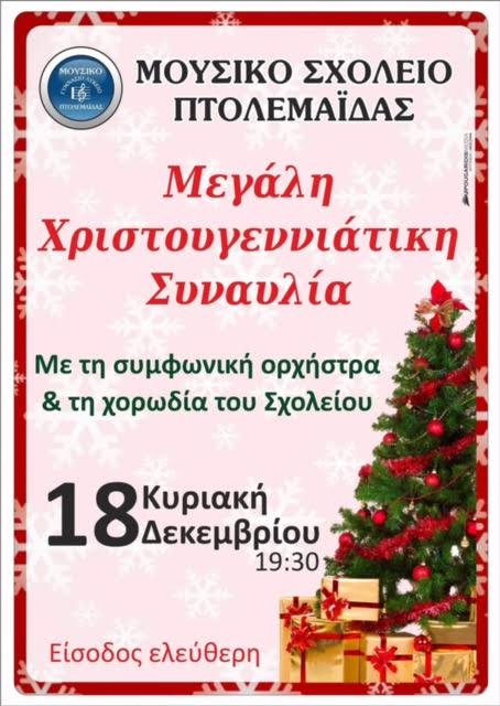 Το Μουσικό Σχολείο Πτολεμαΐδας σας προσκαλεί στην Χριστουγεννιάτικη Συναυλία που θα παρουσιάσει η Συμφωνική Ορχήστρα και Χορωδία του σχολείου, την Κυριακή 18 Δεκεμβρίου 2016 και ώρα 19:30 μ.μ., στο αμφιθέατρο του σχολείου.