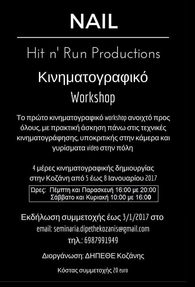 Το ΔΗ.ΠΕ.ΘΕ. Κοζάνης σε συνεργασία με την ομάδα NAIL πραγματοποιεί το πρώτο Workshop Κινηματογράφου στην Κοζάνη. Το workshop θα πραγματοποιηθεί από 5 έως 8 Ιανουαρίου 2017, με ανοιχτή συμμετοχή προς όλους. Κατά την διάρκεια του workshop, οι συμμετέχοντες θα έχουν την ευκαιρία να μάθουν τις τεχνικές του αντάρτικου κινηματογράφου, να πάρουν μέρος στα γυρίσματα μέσα στην πόλη (ως ηθοποιοί και ως crew) και να δουν το αποτέλεσμα των δημιουργιών στο διαδίκτυο. Μέσα από το Workshop, θα αναδειχτούν οι κρυφές και μη γωνιές της πόλης της Κοζάνης, δίνοντας live ερμηνείες με κινηματογραφικό set τους δρόμους.